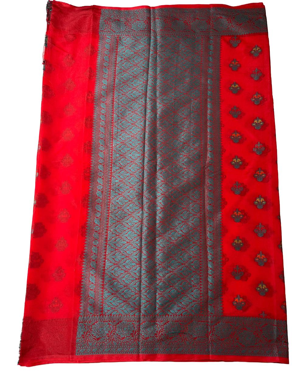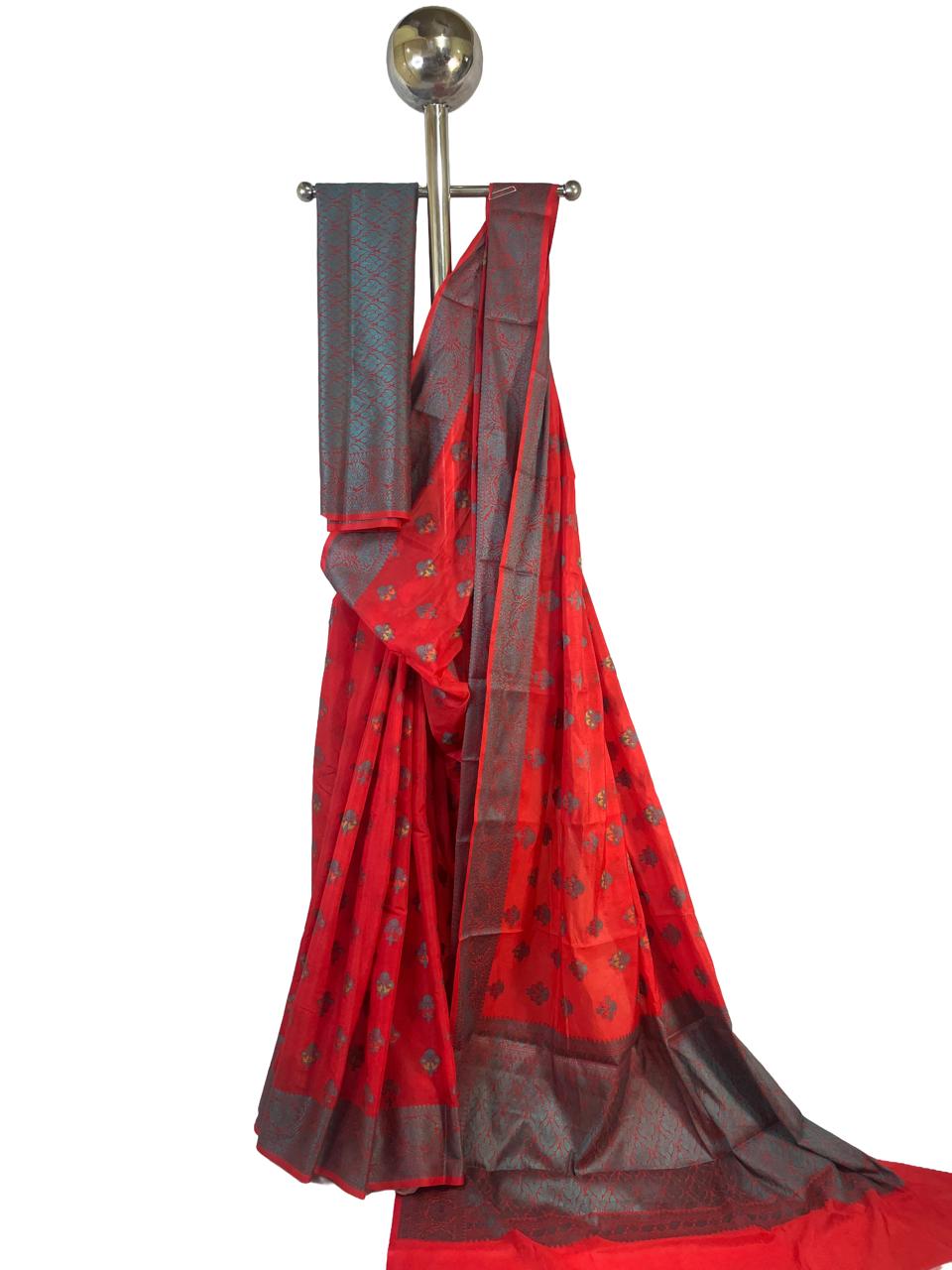 Elevate your festive wardrobe with this stunning Red Soft Silk Blend Saree from Brinda Revival, crafted to blend traditional charm with modern elegance. The saree features a rich dual-tone grey zari jacquard weave that runs beautifully across the body, complemented by delicate multi-colour floral buttas that enhance its ethnic appeal.