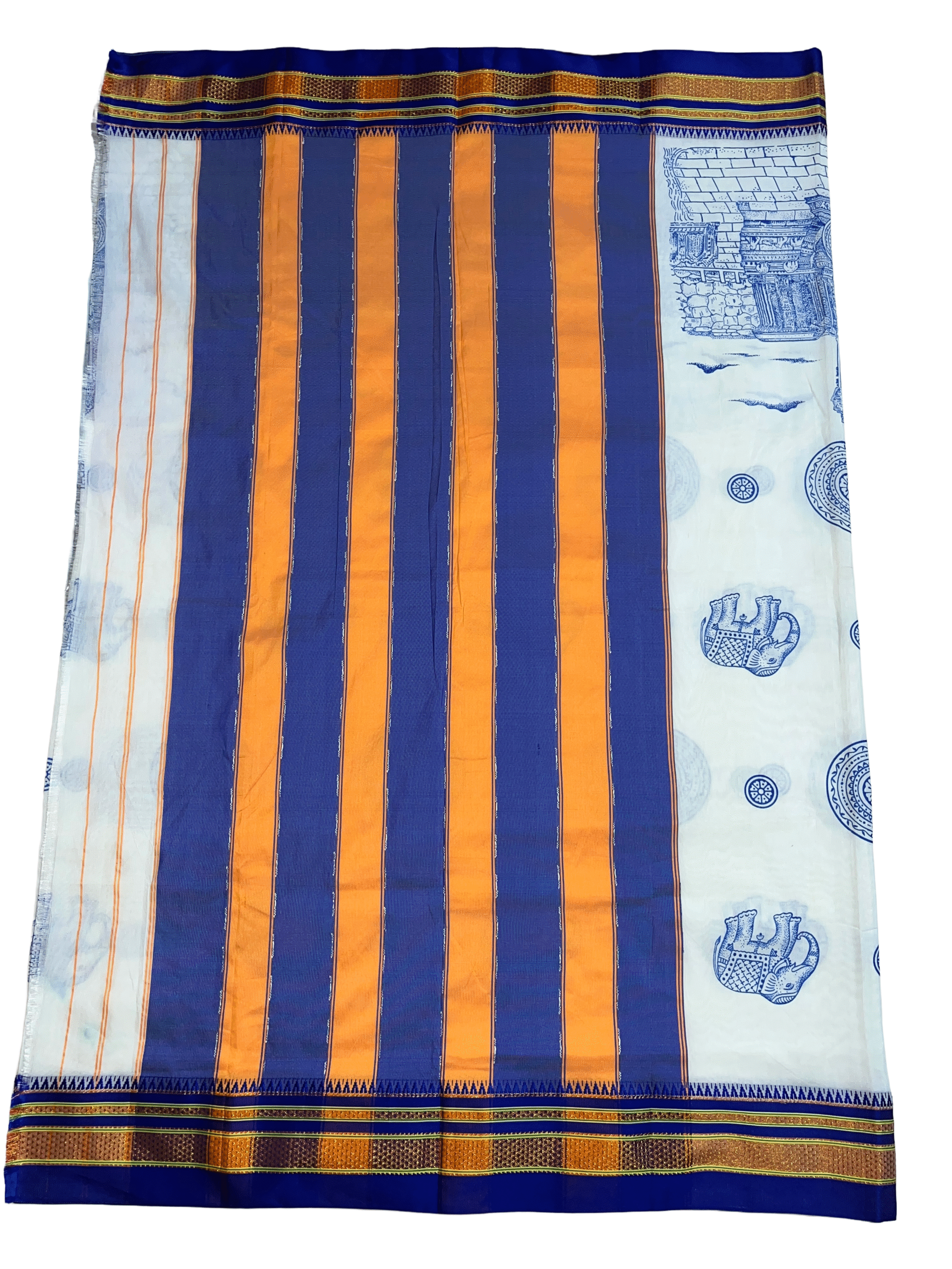 The saree is beautifully complemented by a royal blue border accented with luxurious golden zari, adding a touch of regal charm. The pallu stands out with bold navy and gold stripes, creating a striking contrast that enhances the overall drape.