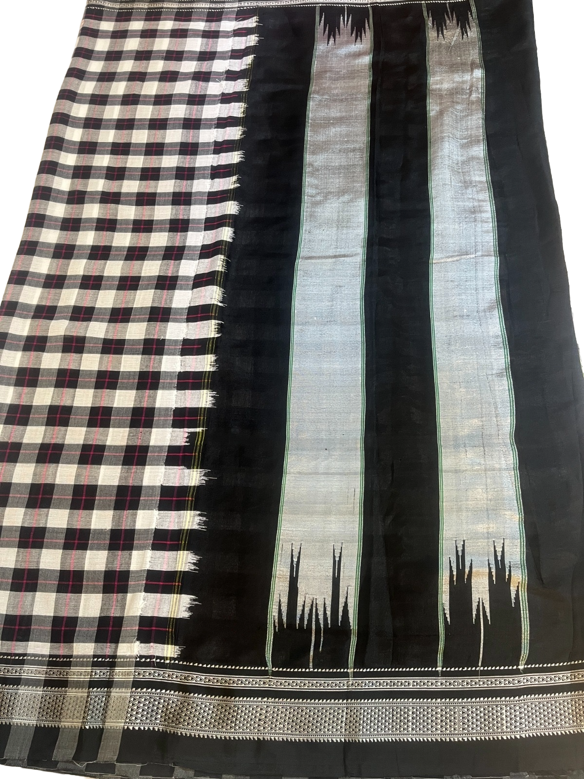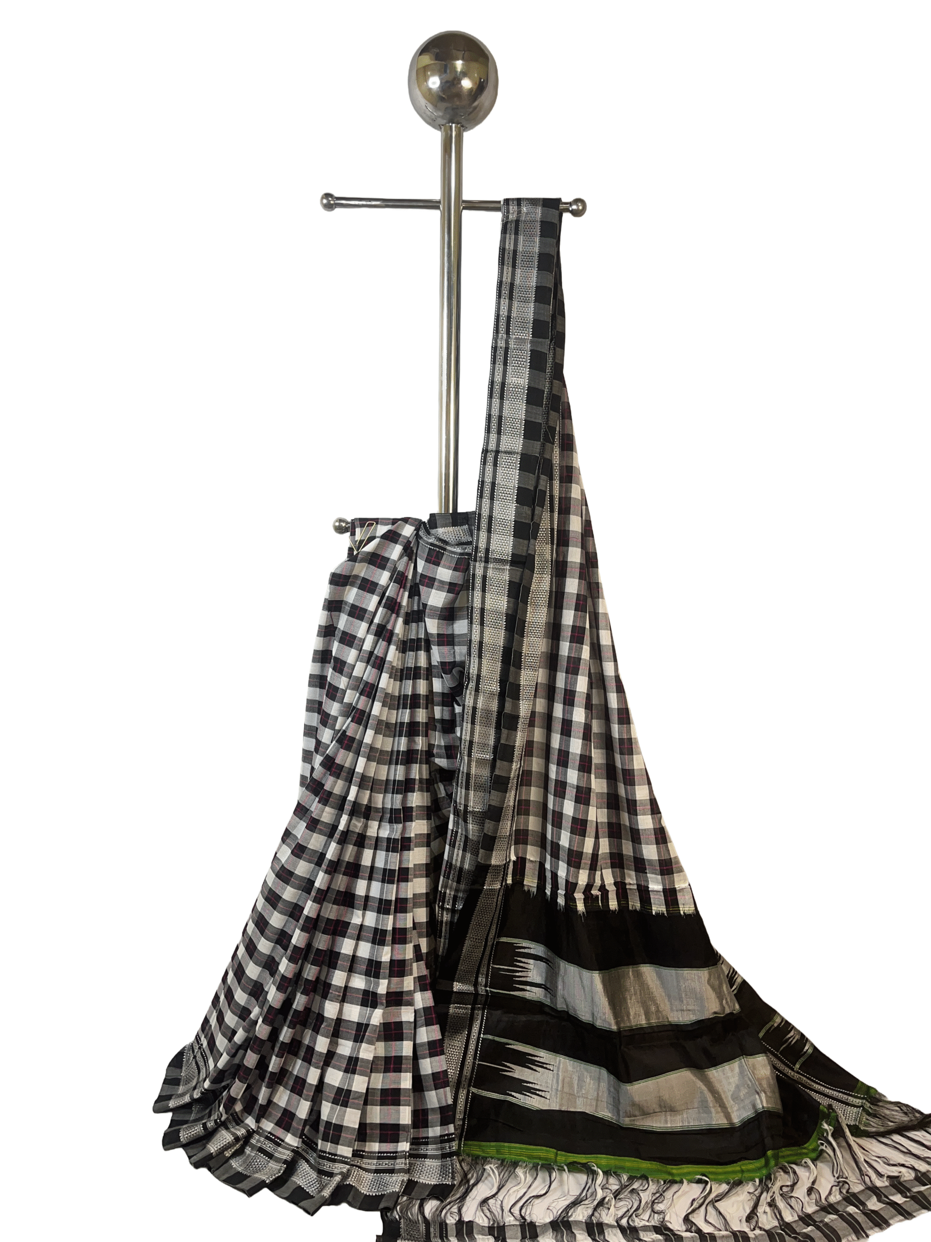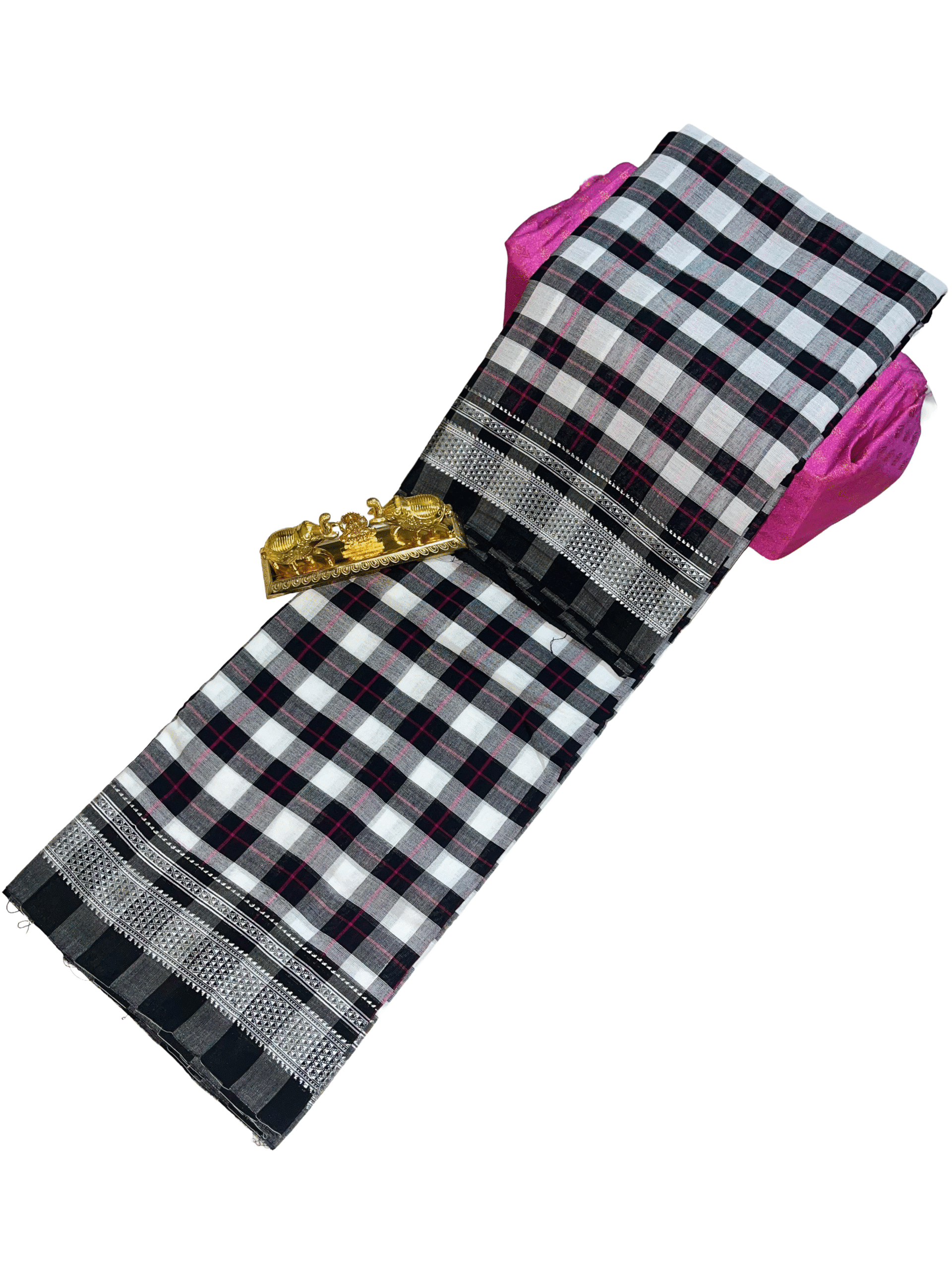 🖤 Black & White Checks Saree with Pure Cotton Body and Rich Pure Silk Pallu – Description