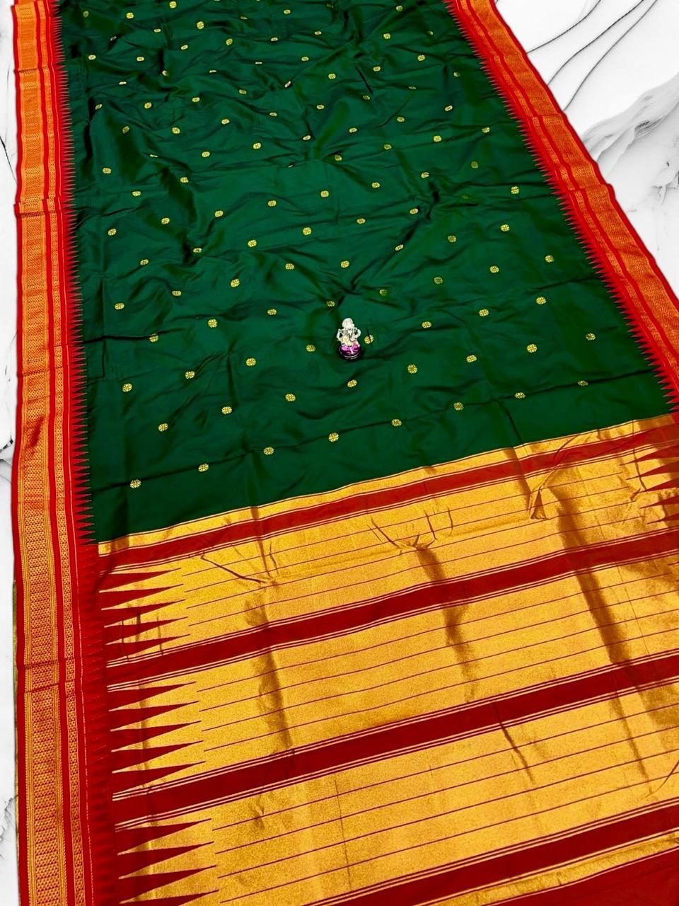 This exquisite bottle green Premium Katan Silk saree is adorned with elegant gold butta motifs throughout the body, giving it a luxurious and festive appeal. The vibrant red border enriched with intricate golden zari weaving enhances its traditional charm, while the grand golden pallu adds a royal touch. Perfect for weddings, festive occasions, and cultural celebrations, this saree beautifully blends richness, tradition, and timeless elegance.