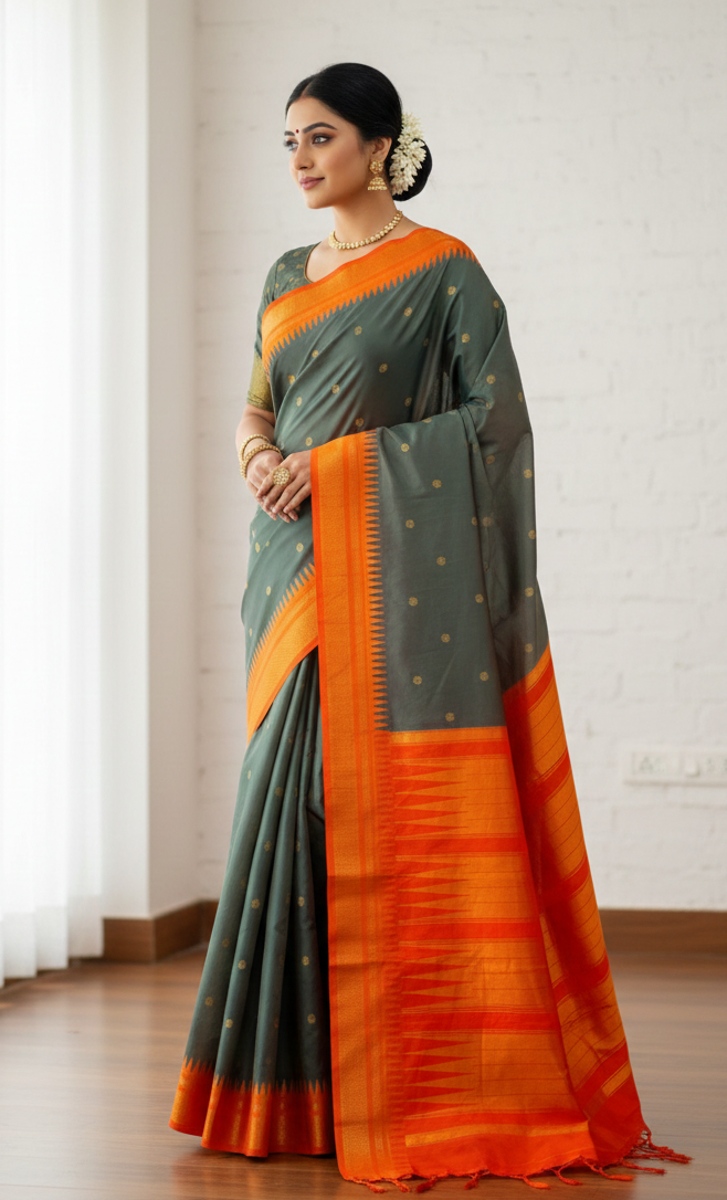 This luxurious Premium Katan Silk saree features an elegant dark teal green body adorned with delicate gold butta motifs that add a subtle shimmer. The vibrant orange border, crafted with intricate zari work, enhances its traditional appeal. Its grand orange zari pallu completes the festive look, making this saree an excellent choice for weddings, celebrations, and cultural occasions. A perfect blend of richness, contrast, and classic craftsmanship, this saree brings timeless elegance to any wardrobe.