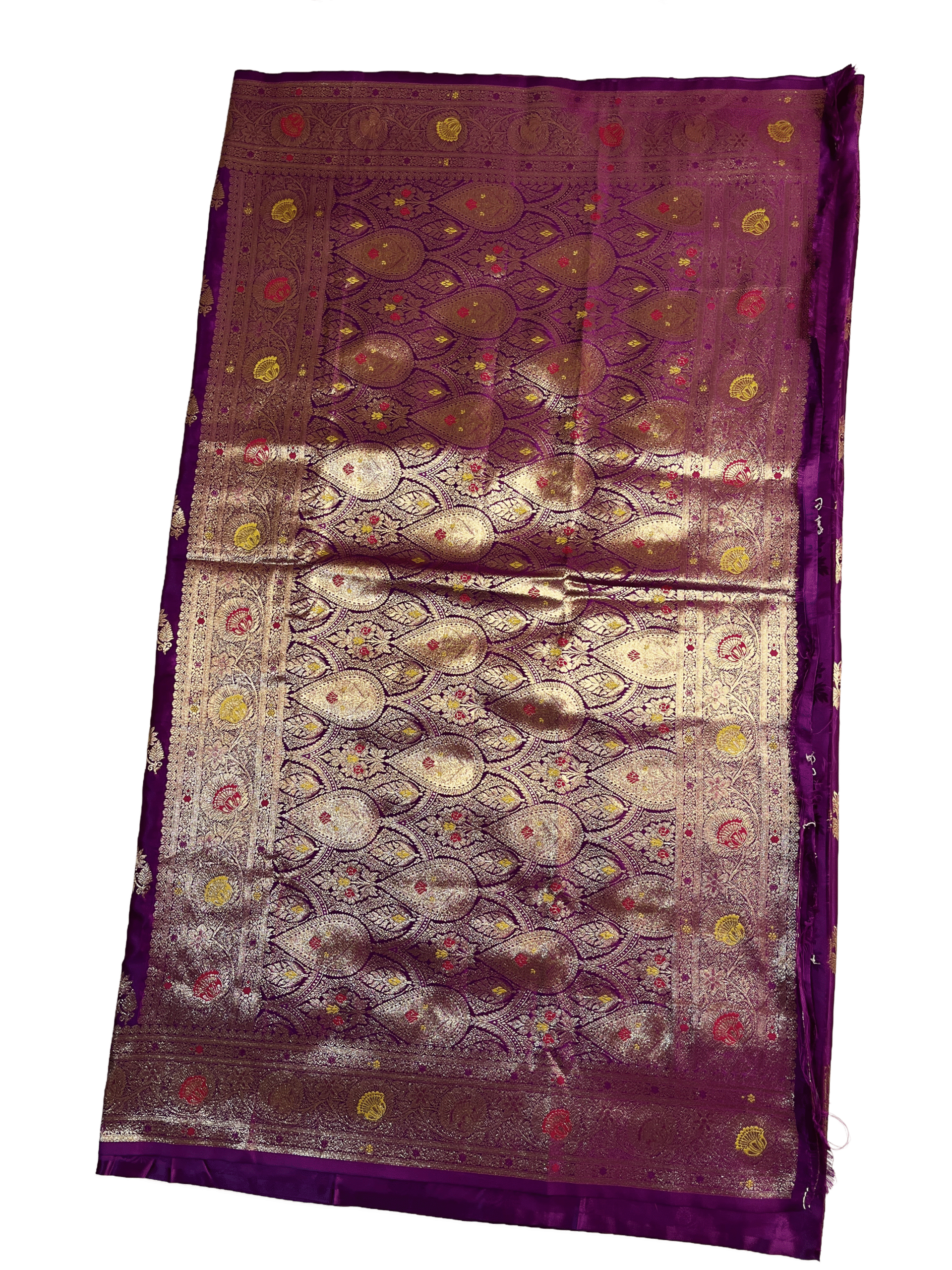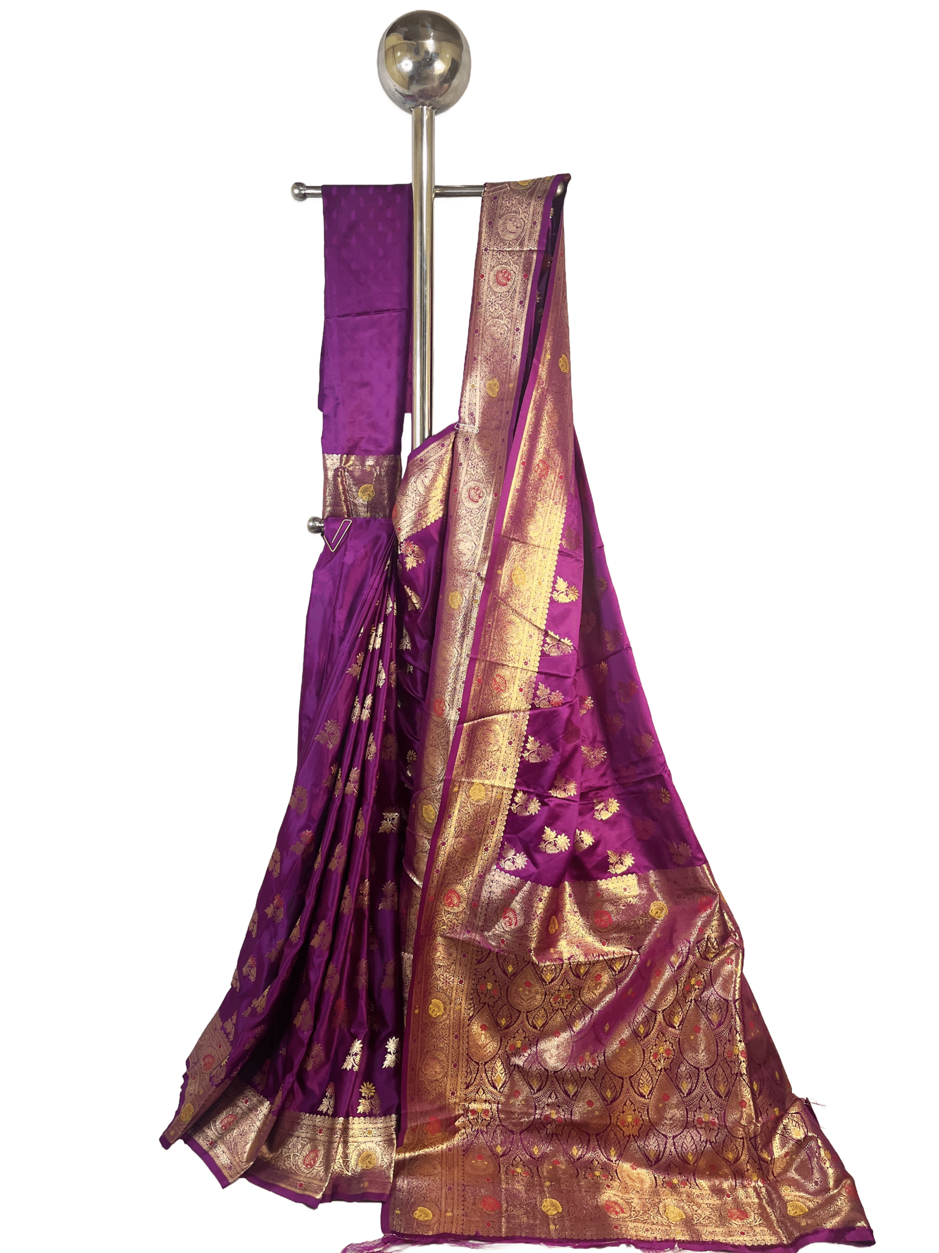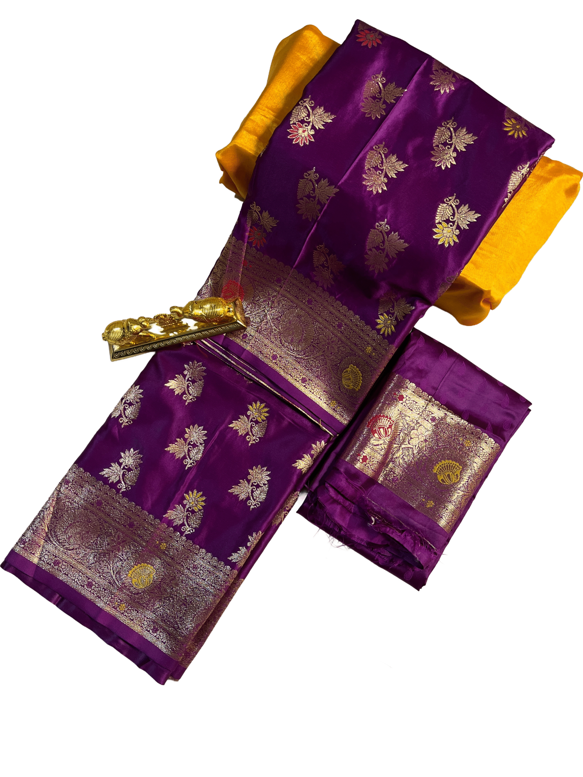 This stunning wine purple saree crafted from luxurious Mushroom Satin Silk offers a smooth, glossy drape with a royal finish. The saree is adorned with elegant floral butta motifs, paired with a rich golden zari-look border featuring multicolor accents for added charm. The grand and intricately designed pallu enhances its regal appeal, making it a perfect choice for weddings, festive celebrations, and cultural occasions. Paired with a matching blouse piece, this saree beautifully blends tradition with modern satin-silk elegance, ensuring a graceful and timeless ethnic look.