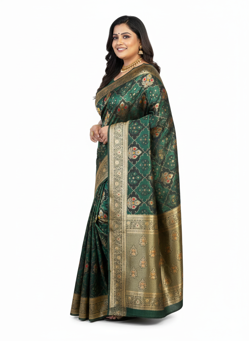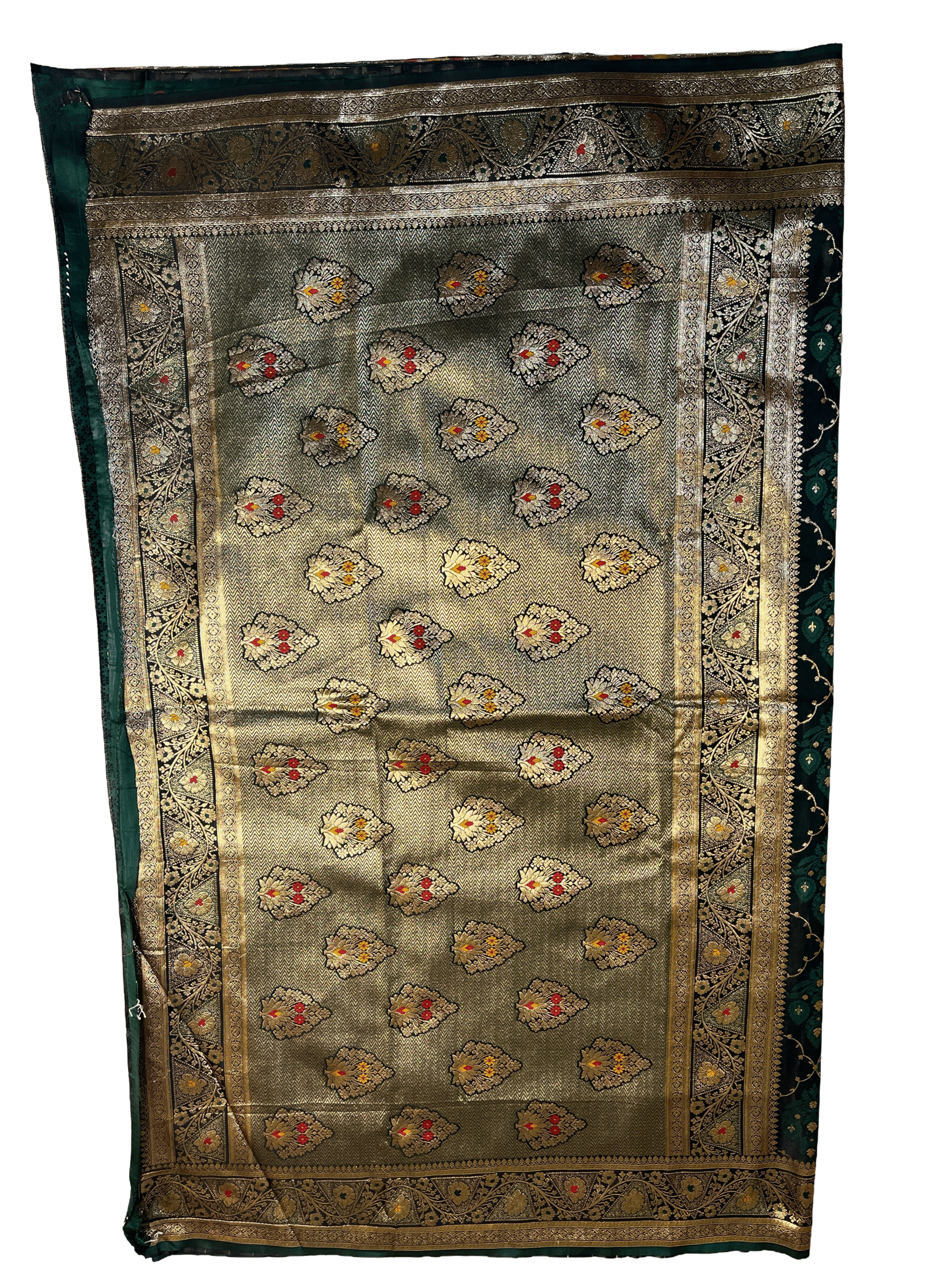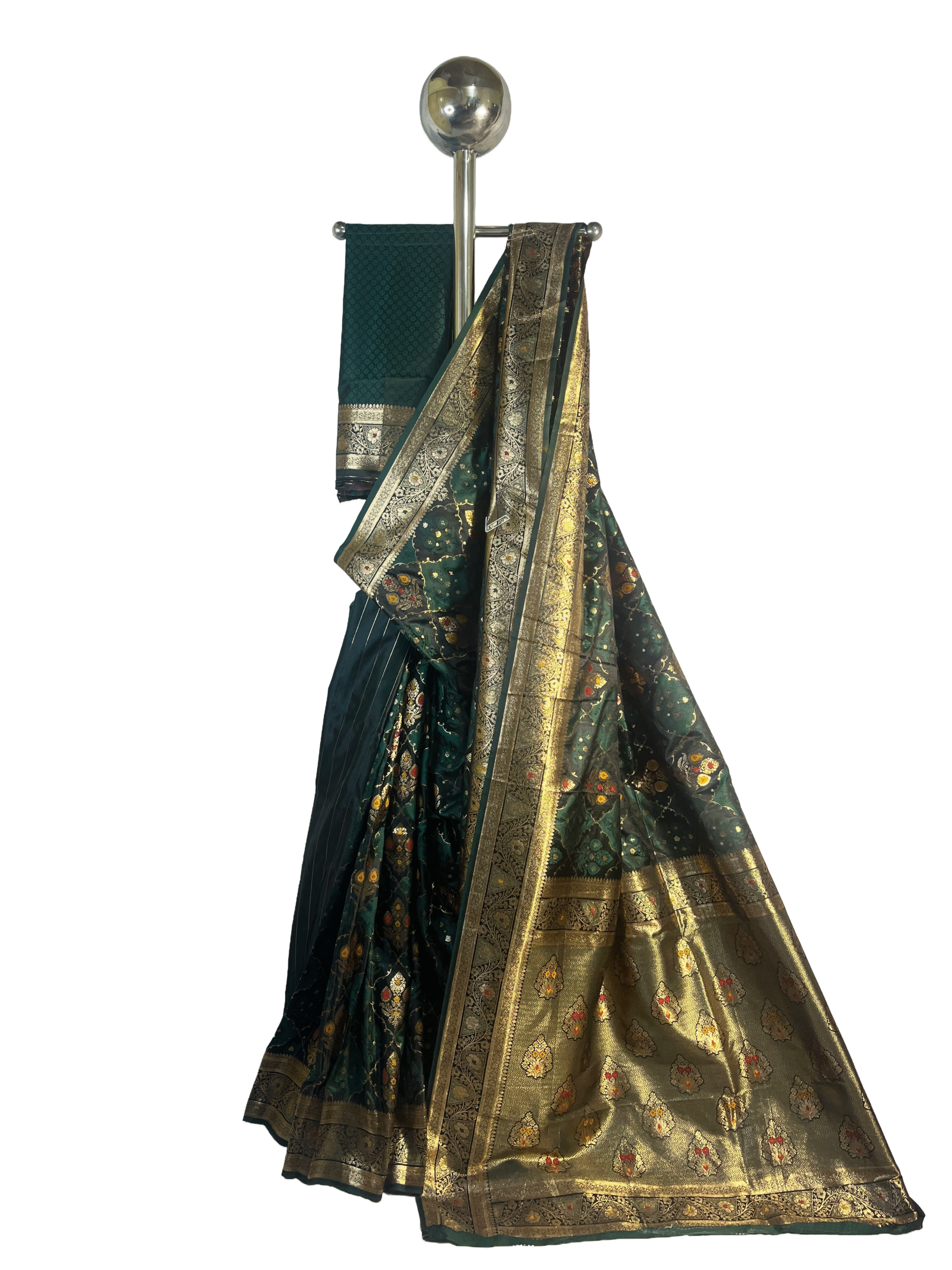 Blouse: Matching dark green blouse with golden zari-style sleeve border