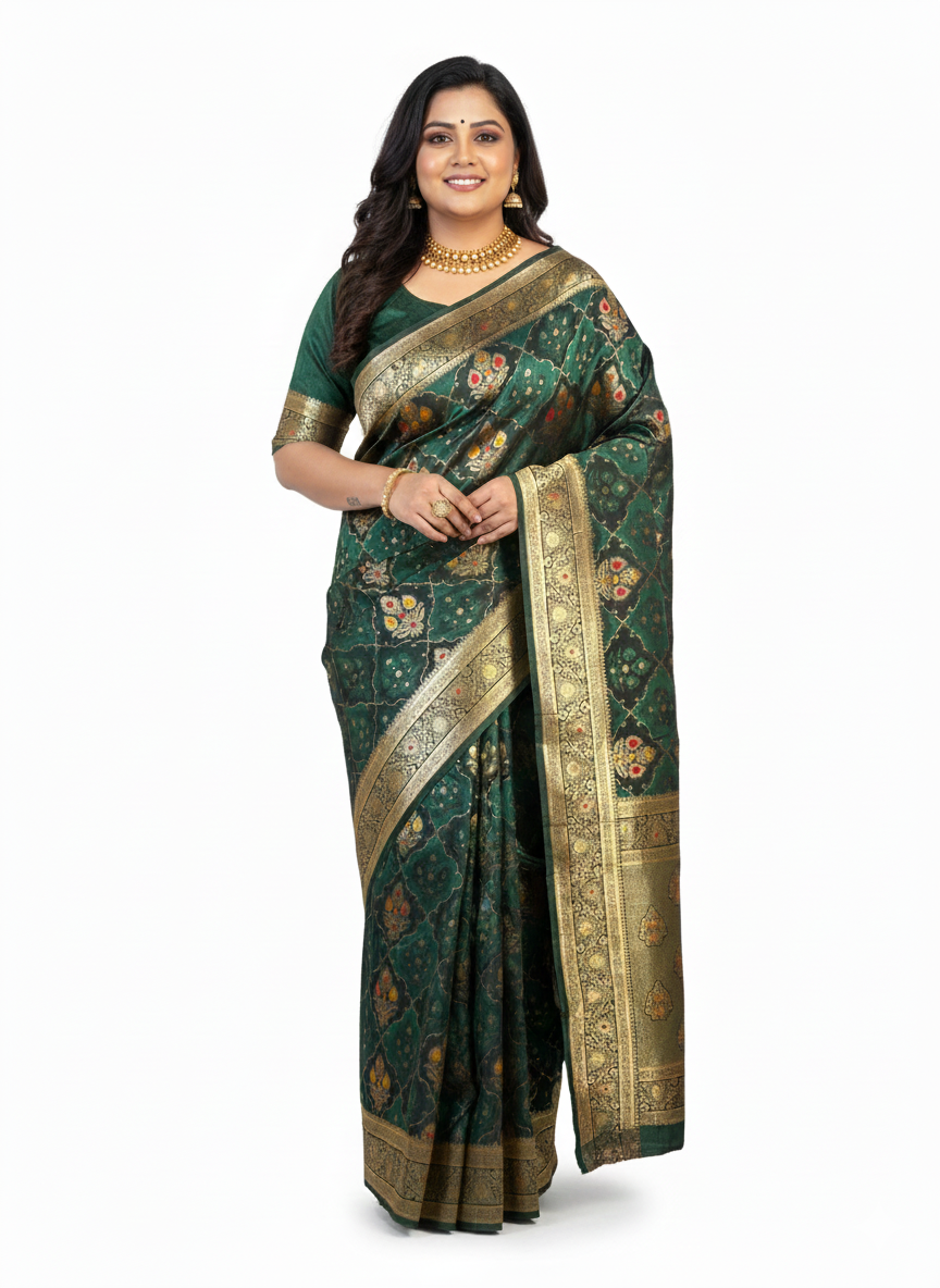 This premium Mushroom Satin Silk saree in a deep green shade features beautifully woven floral and geometric designs, giving it a rich and festive appeal. The saree is enhanced with a luxurious golden woven border and an intricately crafted pallu that elevates its traditional charm. Soft, smooth, and elegant, this saree drapes gracefully and is perfect for weddings, festive functions, and special occasions. Paired with a matching blouse, it blends modern fabric comfort with timeless ethnic beauty.