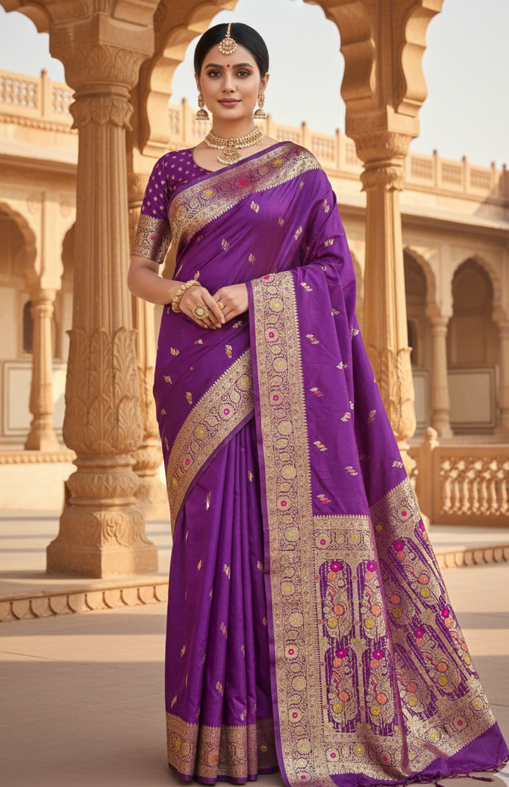 This elegant royal purple saree crafted in luxurious Mushroom Satin Silk offers a rich, glossy drape perfect for festive and grand occasions. The saree is adorned with delicate woven-style butta motifs, enhanced by a stunning golden zari-look border embellished with pink accents for a vibrant finish. Its beautifully detailed pallu adds a regal touch, making it ideal for weddings, celebrations, and traditional events. Paired with a matching blouse piece, this saree blends classic grandeur with contemporary satin-silk elegance.